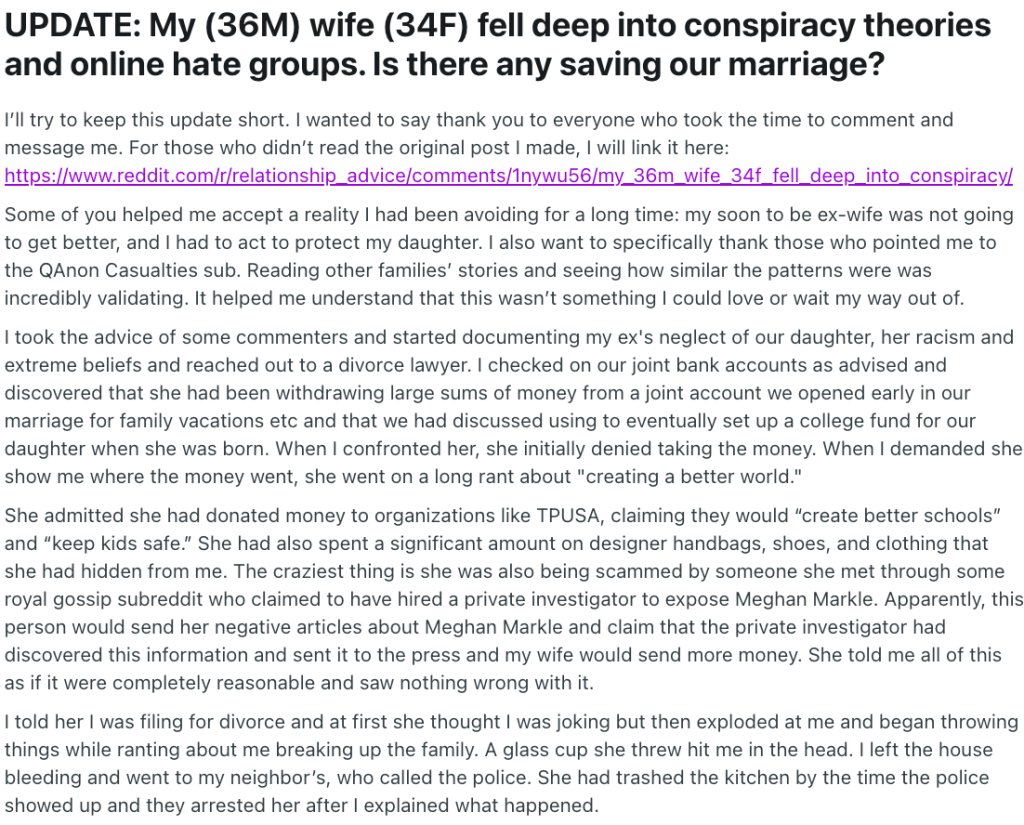 The Reddit comments made something else painfully clear: this is not rare. Story after story echoed the same trajectory. Partners lost to screens. Parents radicalized. Children exposed to paranoia and rage. Savings gone. Friendships ended over a single disagreement about Meghan Markle. Many described the same disbelief — how did something so trivial become so consuming?