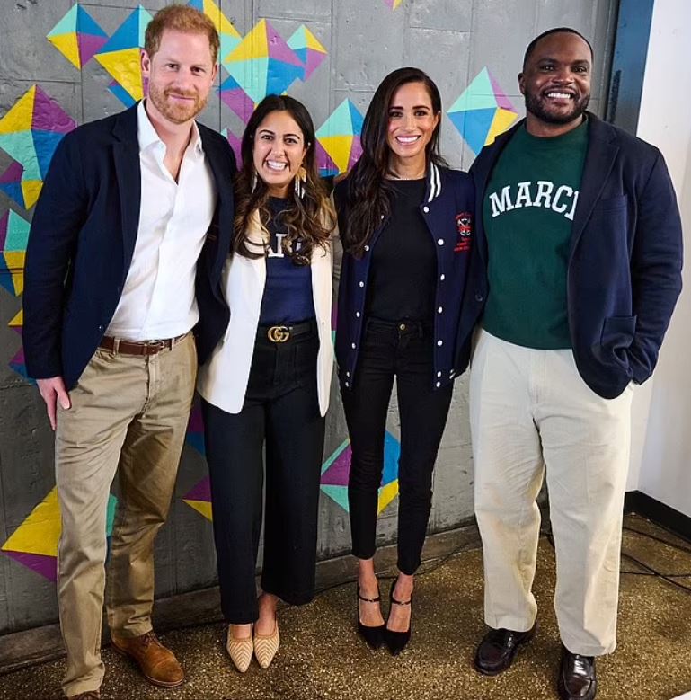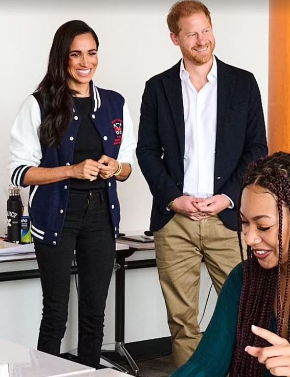 Meghan’s Stylish Ensemble and Meaningful Letterman Jacket Meghan Markle, always a style icon, sported a chic ensemble comprising black skinny jeans, a form-fitting black top, and Jennifer Chamandi heels. What caught the eye, though, was the letterman jacket she proudly wore—a special gift from the debate team at the Robert Clack School in Essex, England, during her March 2020 visit. This jacket not only added a fashionable touch but also symbolized Meghan’s ongoing commitment to education and youth empowerment.