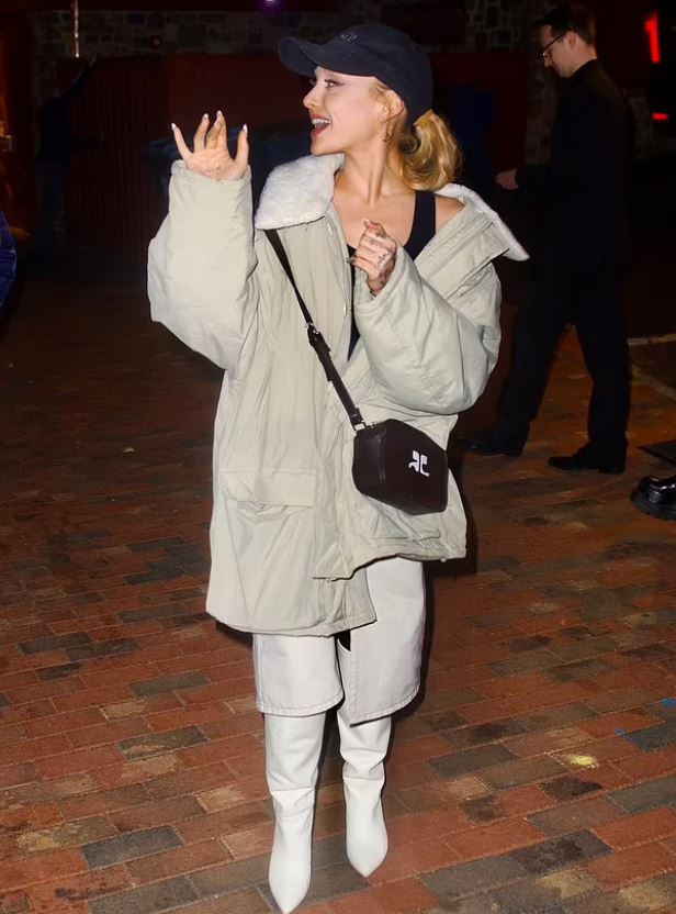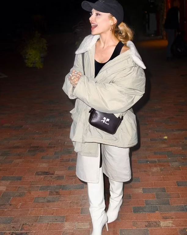 Cloaked in an oversized beige coat with a fuzzy cream-colored collar, Ariana’s long blonde hair peeked out from under a black baseball cap, setting the stage for a low ponytail. The diva added inches to her petite frame with knee-high stiletto boots, creating a striking ensemble that echoed her ever-evolving style.