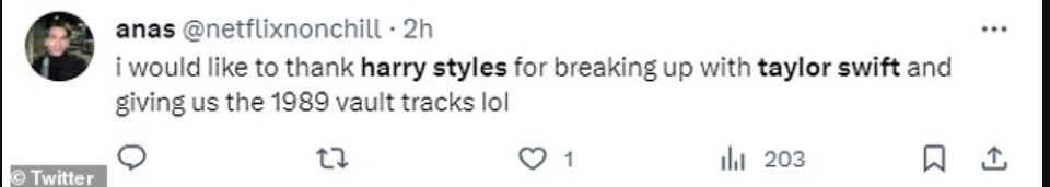Swift’s fans, known as Swifties, took to social media to express their excitement and theories about the unveiled tracks. One tweet humorously noted, ’22-year-old Taylor Swift calling Harry Styles a lying traitor is my favorite thing in the world.’ Another fan thanked Harry Styles for the breakup, attributing it to the release of the coveted ‘1989’ vault tracks.