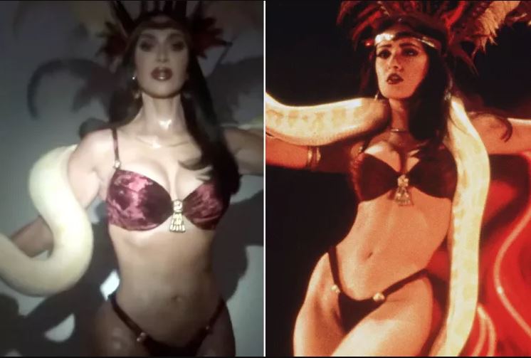 In a nod to the iconic 1996 film, Kim’s tribute recreated the sultry scene where Salma dances with a snake in a bar, including the unforgettable moment where she pours liquor down her leg for director Quentin Tarantino to drink.
