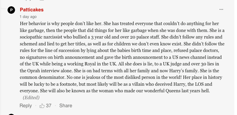 In my view, Meghan Markle’s behavior is the primary reason for the widespread dislike directed towards her. She seems to mistreat those who can’t offer her anything and discards those who have helped her. I perceive her as a sociopathic narcissist who allegedly bullied a child and numerous palace staff. Additionally, there are accusations of deceit, scheming, and rule-breaking to attain titles, including questionable circumstances around the birth of her children. The commenter contends that Meghan’s actions, such as lying in court and during the Oprah interview, have contributed to her negative image. The strained relationships with both her own and Harry’s family are seen as a pattern, making her the common factor. The commenter predicts a negative historical legacy for Meghan, portraying her as a deceptive figure who caused difficulties for Prince Harry, the royal family, and the Queen in her later years.