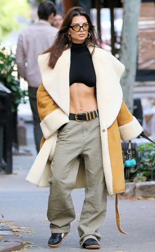 Adding a layer of sophistication to her ensemble, Emily draped herself in a long shearling coat with wide white lapels and cuffs. Her signature long, dark locks were styled straight, and she accessorized with gold hoop earrings and chic sunglasses. The overall look radiated confidence and a keen sense of street style, reaffirming Emily’s status as a fashion icon.