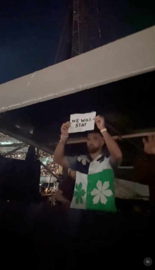 Taylo’s fans have been holding up signs that say “we will stay”. Travis joined that fan project.