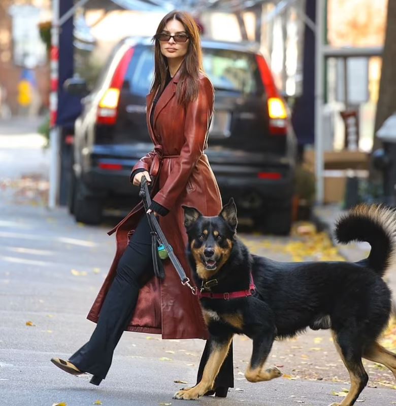 Emily Ratajkowski, the 32-year-old model and entrepreneur, graced the streets of New York City on Tuesday, turning heads in a stunning red leather coat. The fashion icon, who’s currently dating French actor Stephane Bak, exuded glamour as she took her dog, Colombo, for a leisurely walk through the fashionable neighborhood of Soho.
