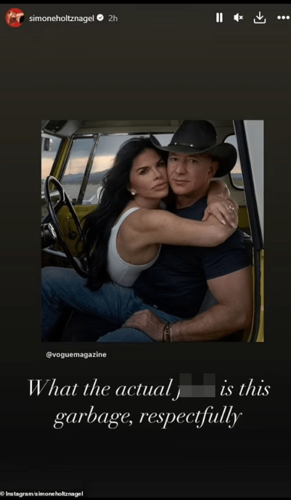 Australian model Simone Holtznagel has criticized the recent Vogue photo shoot featuring Jeff Bezos and Lauren Sanchez. The photo depicts Bezos in a black T-shirt, jeans, and a cowboy hat, with Sanchez wearing a revealing white top, posing in a pickup truck. Holtznagel expressed her disapproval on Instagram, captioning the reshared image with, “What the actual f**k is this garbage, respectfully.”