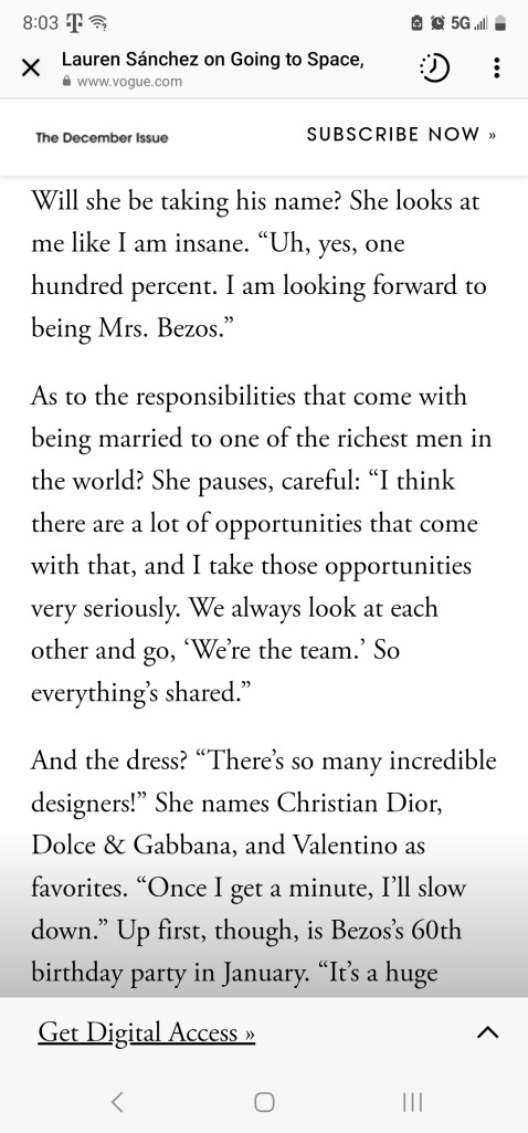 In contrast, if you read Jeff/Lauren’s story, we see a different dynamic. Lauren is going to be “Mrs. Bezos” and it is a job she wanted. She sees it as a lot of opportunities. They are a team but she is an extension of Jeff Bezos. She is fitting in his world.