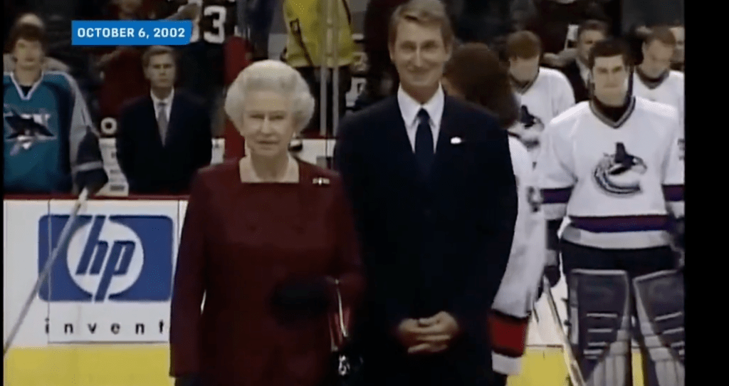 Queen Elizabeth II dropped the ceremonial puck at the opening of an NHL hockey game between the Vancouver Canucks and the San Jose Sharks at GM Place (now known as Rogers Arena).