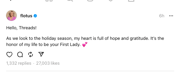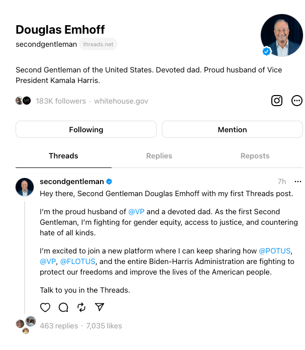 - POTUS, FLOTUS, VP, First Gentleman, and others exodus to Threads from X today.