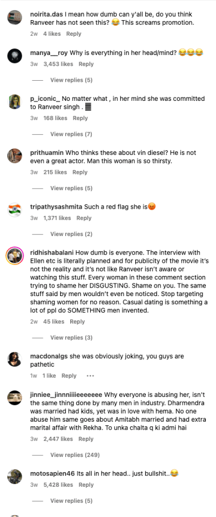 - How dumb is everyone. The interview with Ellen etc is literally planned and for publicity of the movie it’s not the reality and it’s not like Ranveer isn’t aware or watching this stuff. Every woman in these comment section trying to shame her DISGUSTING. Shame on you. The same stuff said by men wouldn’t even be noticed. Stop targeting shaming women for no reason. Casual dating is something a lot of ppl do SOMETHING men invented.
