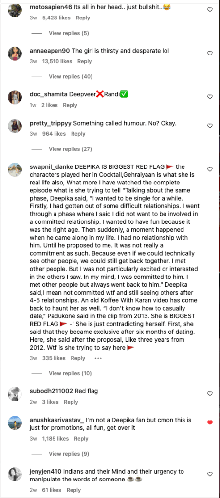 The comments reflect a wide range of opinions about Padukone’s relationship with actor Ranveer Singh. Some suggest that the couple kept their relationship private for three years, raising questions about fidelity and authenticity. Others criticize perceived contradictions in her statements, particularly regarding the timeline and exclusivity of their relationship.