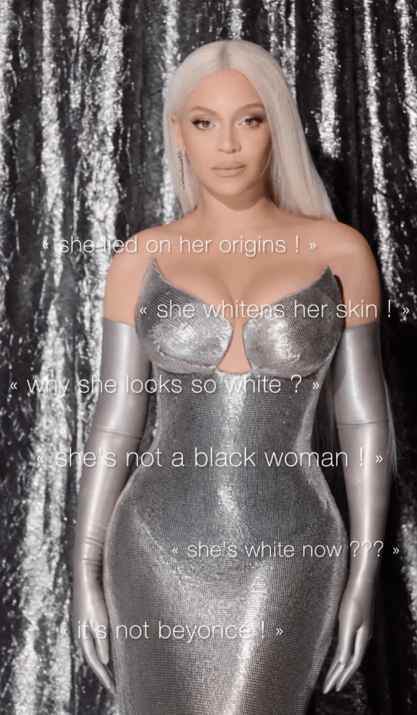 Came across this today and decided to post it after seeing all of the stupid ignorant self, hating racist statements about her, lightening her skin, and wearing platinum hair wanting to be white. She does a film, called the renaissance, where the whole theme is silver with silver hair, a silver carpet, and suggested silver attire and you bozos decide that she’s trying to be a white woman and is bleaching her skin? .. How sad is it that some of her own people continue the stupid narrative with hate and jealousy. Duh, she wore silver hair to match her silver dress as a fashion statement clown. . ALIEN Superstar duh! What’s really sad is that a white woman had the audacity to reach out to Neal Beyonces hairstylist she was from TMZ to say that the fans are saying that she wants to be white and she wanted to get a statement about it from Neal. . Well that made, my blood boil , that this white woman felt so entitled to discuss her blackness. What’s really most disappointing is that the some Black people yes you bozos that’s on social media. Lying and faking and acting like you’re so ignorant that you don’t understand That black women have worn platinum hair since the Etta James days. I just went and looked at all the beautiful talented black celebrities who have worn platinum hair and it has been just about everyone of them at one time or another. Are they all trying to be white? I am sick and tired of people attacking her. Every time she does something that she works her ass off for and is a statement of her work ethic , talent and resilience. Here you sad little haters come out the woodwork. Jealousy and racism , sexism , double standards , you perpetuate those things . Instead of celebrating a sister or just ignoring if you don’t like her. , I am sick of you losers. I know that she is going to be pissed at me for doing this, but I am fed up ! This girl minds her own business. She helps people whenever she can. She lifts up & promotes black women and underdogs at all times. Cont.