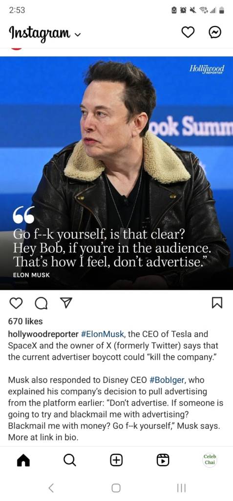 On November 29th, 2023, Elon offered to ask an advertiser to F**K himself. Many laud this as honest, others find it tone deaf. In the video, he is blaming the advertisers for Twitter’s demise and that he is ‘documenting’ it in great detail. Mr. Andrew Ross Sorkin held his own and pushed back and told him that the advertisers don’t like what Elon is saying, that’s why they are leaving.