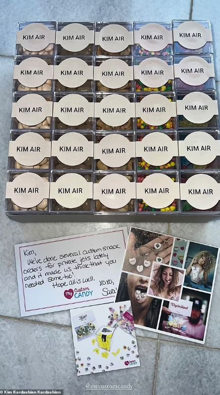 Unveiling the Sugary Sky: In a recent Instagram Story, Kim Kardashian showcased an array of colorful candies, specially curated for her $150 million private jet, ‘Kim Air.’ Boxes adorned with the jet’s moniker hint at a luxurious touch to air travel. This sugary spectacle provides a delightful contrast to the ongoing social media drama, where Kardashian’s comment section has been flooded with snake emojis after Taylor Swift’s revelations.