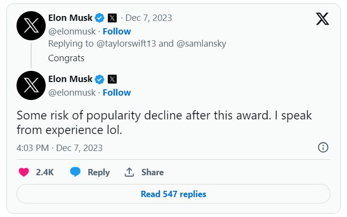 Musk’s Ominous Message: A Risk to Popularity? In response to Swift’s appreciative post, Musk congratulated her with a simple “congrats” but didn’t stop there. The tech magnate, who himself received the Person of the Year title in 2021, dropped an intriguing comment: “Some risk of popularity decline after this award. I speak from experience.” This ominous message from Musk stirred a flurry of reactions from fans and followers, catapulting the exchange into the spotlight.