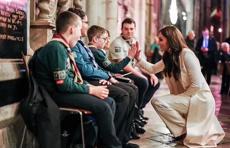 Kate stole the show inside the Abbey, leading the royal family and interacting with children who have gone ‘above and beyond’ for charity. She spent time with seven-year-old Oscar Burrow, who raised over £40,000 for a children’s hospice. Kate’s compassion and support were evident as she crouched down to chat with Oscar and later high-fived scouts from the 3rd Upton Scout Group.