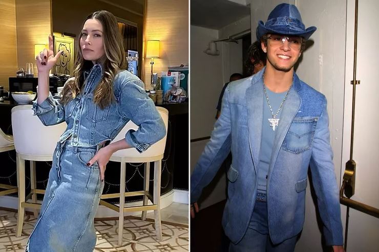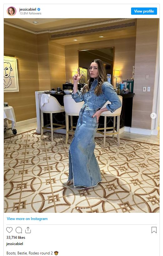 Biel’s denim delight consisted of a light-wash denim maxi skirt paired with a cropped, structured denim top, creating a look that effortlessly combined retro charm with contemporary flair. In a nod to Timberlake’s historic ensemble, she playfully posed with a finger gun to the sky in an Instagram post captioned, “Boots, Bestie, Rodeo round 2 🤠.” While she opted out of the denim cowboy hat, she added a Rodeo-appropriate touch with pointed brown boots, showcasing them in a captivating video shared with her followers.