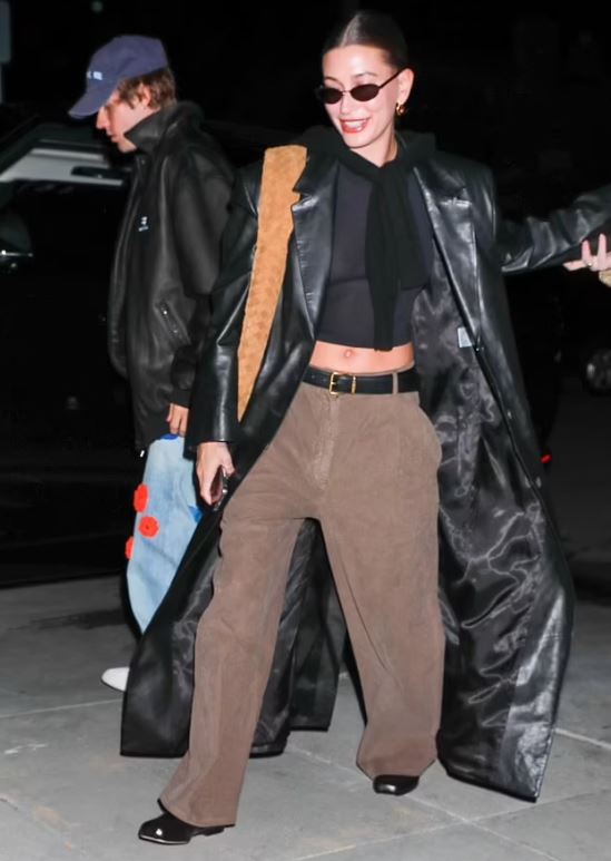 In a recent church outing, Hailey and Justin Bieber showcased their impeccable style. Hailey, founder of Rhode, donned a black cropped top with tan low-waisted pants, a black belt, and a long leather coat. Minimal accessories, oval-shaped shades, and a sleek bun completed her chic look. Justin opted for comfort with baggy jeans, an oversized black leather jacket, and white sneakers.