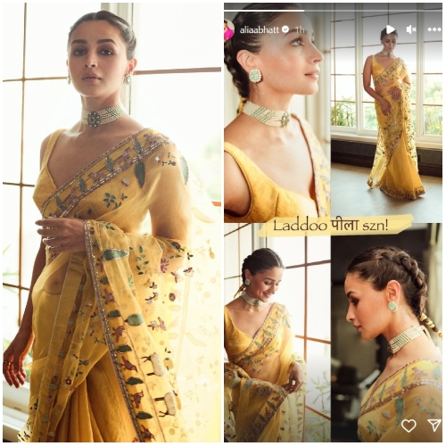 Alia strategically posed against a window backdrop, allowing her fans to appreciate her side and back profiles. Accompanying the pictures was a clever wordplay caption, “Yellow there,” showcasing Alia’s playful side. She further embraced the ‘Laddoo Peela szn’ with a collage shared on her Instagram Stories, solidifying the trend she effortlessly started.