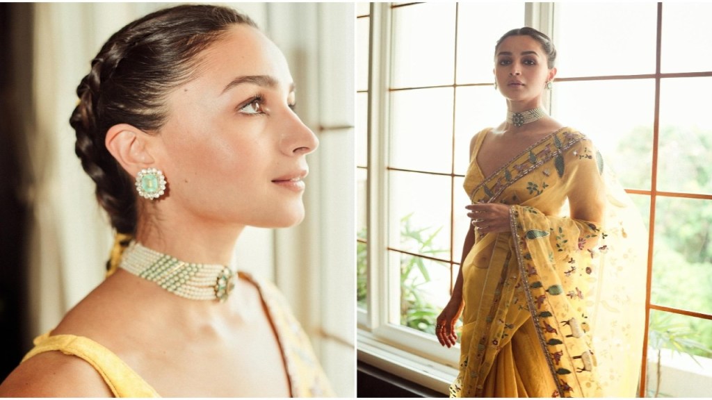 Alia, on December 15, took to Instagram to share a series of snapshots capturing the essence of her captivating ensemble. The focal point of her look was a stunning yellow-colored net saree intricately adorned with embroidery, paired flawlessly with a chic sleeveless blouse. Complementing the ensemble, Alia adorned herself with exquisite jewelry, featuring an emerald choker necklace, matching studs, and a ring that added a touch of sophistication to the overall appearance.