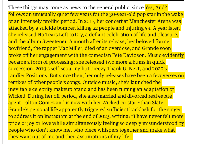 Recent Projects: The release of the single “Yes, And?” and her involvement in the adaptation of “Wicked.” It also touches upon her addressing personal matters on Instagram at the end of 2023.
