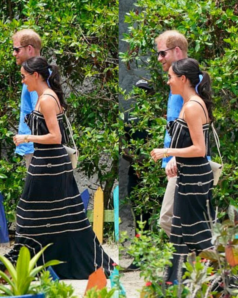 Meghan’s wardrobe choices during the day were a pink and cream jacquard dress by Colombian designer Johanna Ortiz, reflecting her support for local talent.