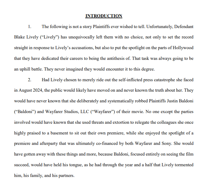 - Wayfarer, Baldoni, and others claim Lively and Reynolds engaged in civil extortion, demanding concessions and creative control over It Ends With Us under threats of reputational destruction.
