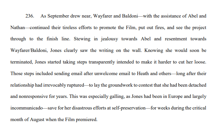 - In August 2024, Jones severed ties with Baldoni and Wayfarer, aligning herself fully with Lively and Sony in an effort to salvage her own reputation.