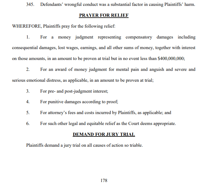 - Plaintiffs are seeking $400 million in damages for lost earnings, emotional distress, and reputational damage.