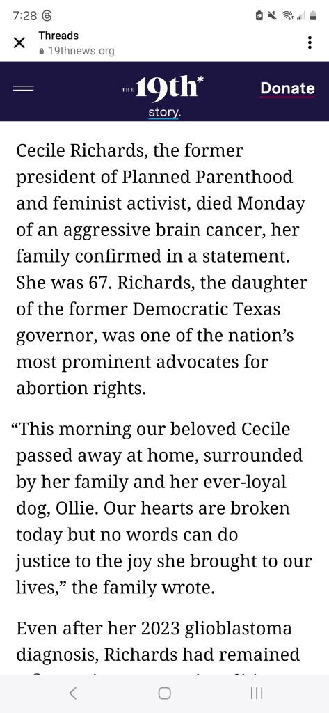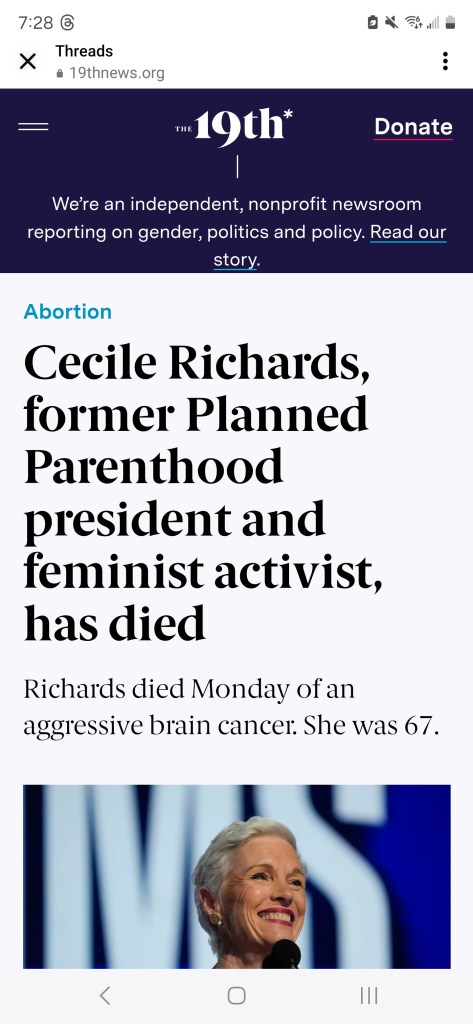 Cecile Richards, former president of Planned Parenthood and a leading feminist activist, passed away at 67 from brain cancer. A lifelong advocate for abortion rights, she played a key role in Democratic politics, Planned Parenthood’s expansion, and reproductive rights activism. Richards started in politics as a teenager, later working on her mother’s Texas gubernatorial campaign and as a labor organizer.