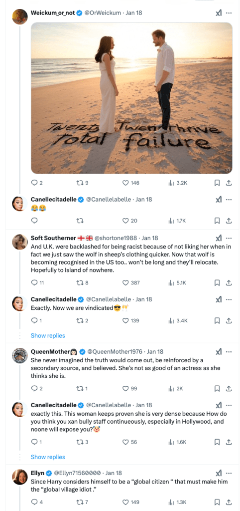 - “The UK was backlashed for being racist when they turned on Meghan. Now the US is doing the same.”