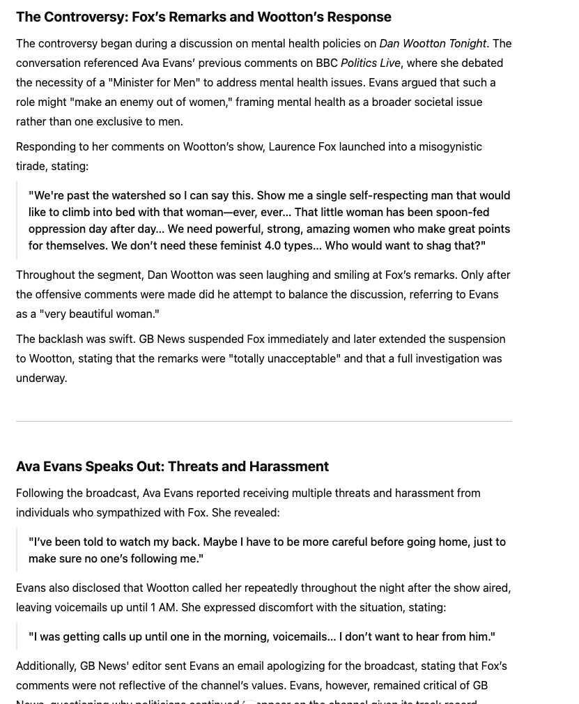 In September 2023, Wootton was suspended from GB News following an incident where guest Laurence Fox made sexually disparaging comments about journalist Ava Evans on Wootton’s show. The channel deemed the remarks “totally unacceptable,” and Wootton apologized for not intervening during the broadcast. Subsequently, his contract with MailOnline was terminated, and Ofcom, the UK’s communications regulator, launched an investigation into the incident, concluding that the show breached broadcasting rules. Following these events, Wootton announced his departure from GB News to establish an independent platform, “Dan Wootton Outspoken,” in March 2024.