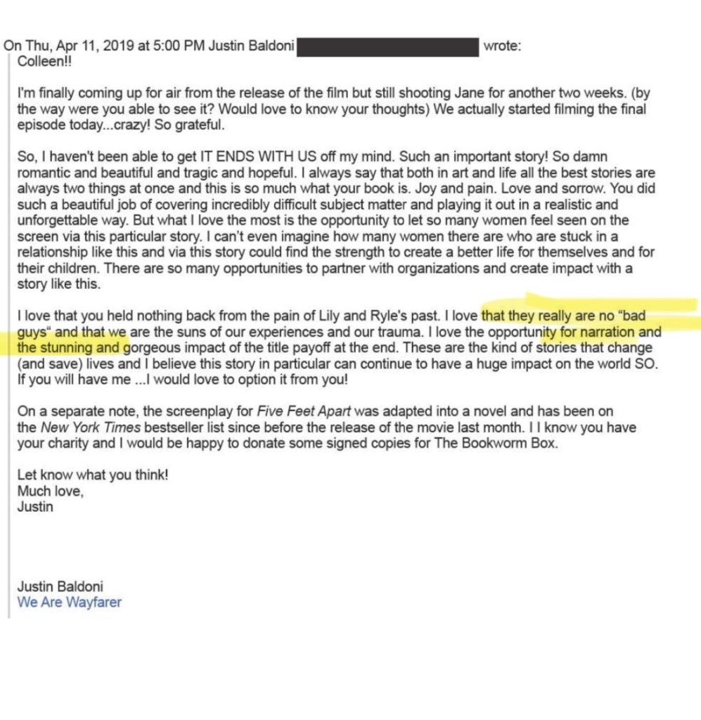 The controversy first exploded when an old email from Baldoni to Colleen Hoover was leaked. In it, he wrote: