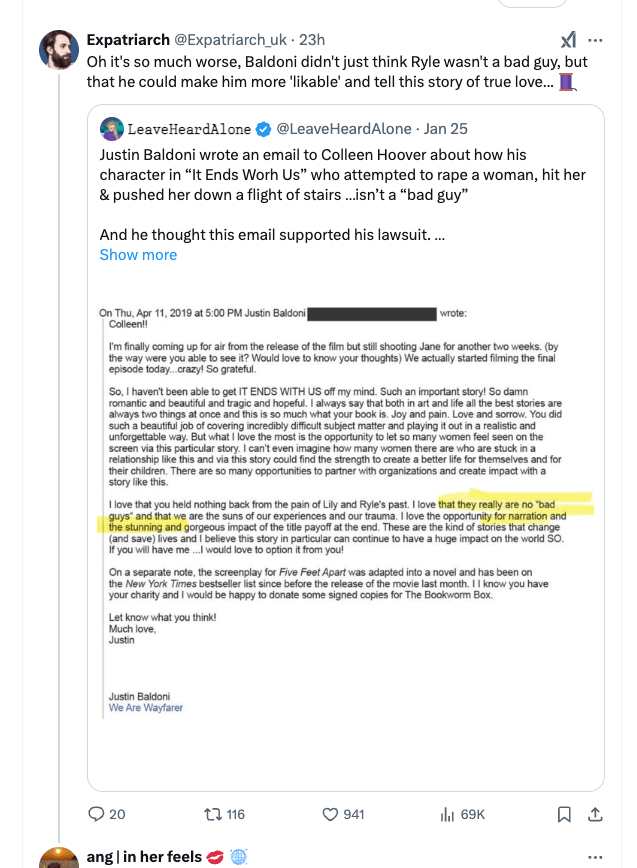 Instead of recognizing that Ryle’s likability is what traps Lily in the cycle of abuse, Baldoni saw it as an opportunity to make him even more sympathetic. He later added: