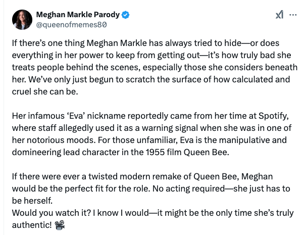 Regarding a Queen Bee remake—casting someone in a role based on tabloid narratives rather than acting skills or suitability seems like a stretch. If such a film were made, a fairer approach would be to assess actors based on their performances rather than preconceived biases. The one that truly gets me is the ‘serial abuser’ but there are no names for the sources. Vanity Fair also wrote an 8,000 word tedious gibberish from Carole Tominey. Meghan Markle Parody is another such account that amplifies these stories. The person who runs the account is very friendly and intelligent.