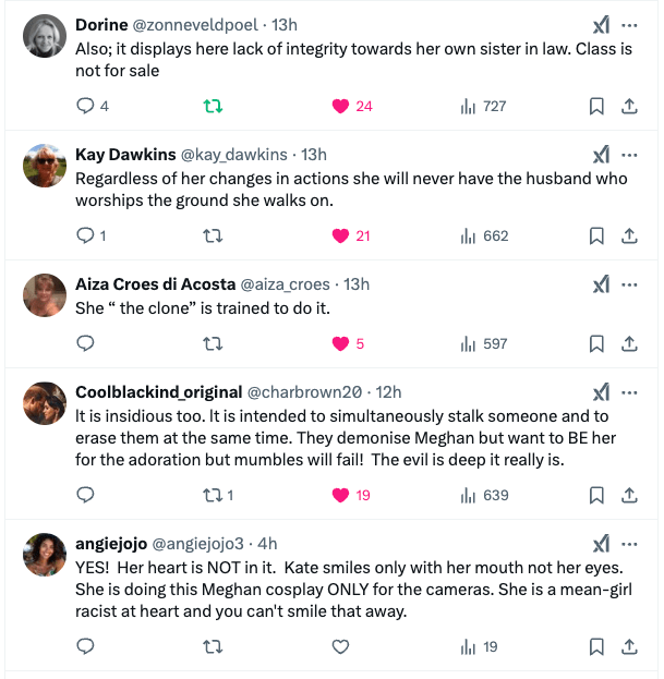 The tendency to reduce complex human behavior to simple narratives of imitation or competition does a disservice to our understanding of public figures. Every public figure, including both Catherine and Meghan, brings their own authentic approach to their roles while operating within certain institutional constraints.