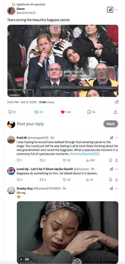 On the other hand, the same image was used in a separate post to tell a completely different story. This post described the moment as deeply emotional, suggesting that Prince Harry was overwhelmed with feelings during a bagpipe salute, likely remembering his late grandmother, Queen Elizabeth II. Here, the framing shifted from scandalous speculation to one of grief and honor, painting Harry as a man struggling with loss rather than a disinterested husband.
