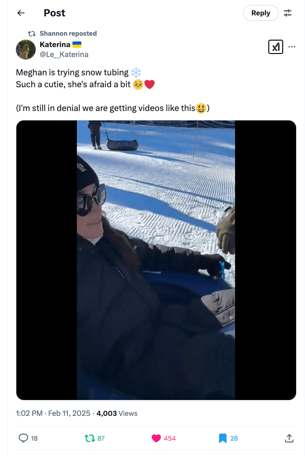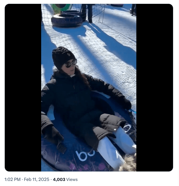 The video, which surfaced on social media, captures Meghan at the top of a snow tubing hill, bundled up in winter gear, flashing an endearing smile as she hesitates slightly before taking the plunge. Viewers noted her nervous laughter, as well as Prince Harry’s unmistakable giggle in the background—one that has become an affectionate signature of their public appearances. Fans reacted warmly, celebrating this candid snippet of their lives.