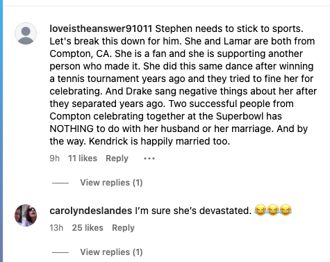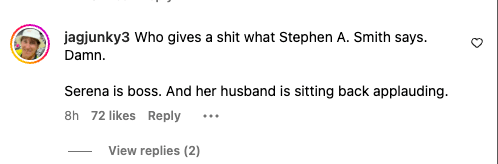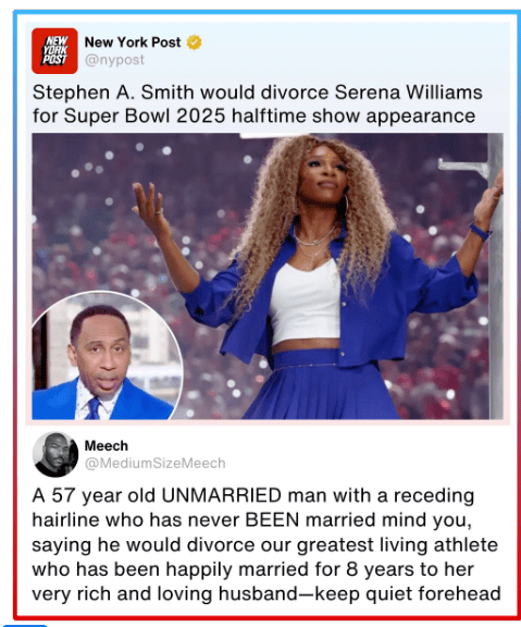 ESPN commentator Stephen A. Smith voiced his disapproval of Williams’ Super Bowl performance. On “First Take,” he stated, “If I’m married and my wife is going to join trolling her ex, go back to his ass, ’cause clearly you don’t belong with me.” Smith’s comments implied that Williams’ participation was inappropriate given her marriage to Reddit co-founder Alexis Ohanian.