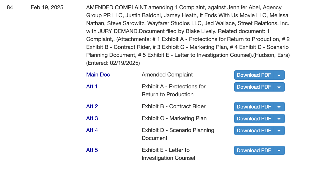 - Blake Lively sued Wayfarer Studios, Justin Baldoni, and others in Case No. 1:24-cv-10049-LJL, alleging sexual harassment, retaliation, defamation, and breach of contract related to the filming of It Ends With Us.