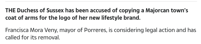 The Mayor of Porreres’ claim that Meghan Markle “plagiarized” the town’s coat of arms with her As Ever logo is an overreach and could be seen as defamatory, given the lack of concrete evidence of intentional copying. The accusation suggests wrongdoing where none has been proven, potentially harming Meghan’s reputation and business interests.