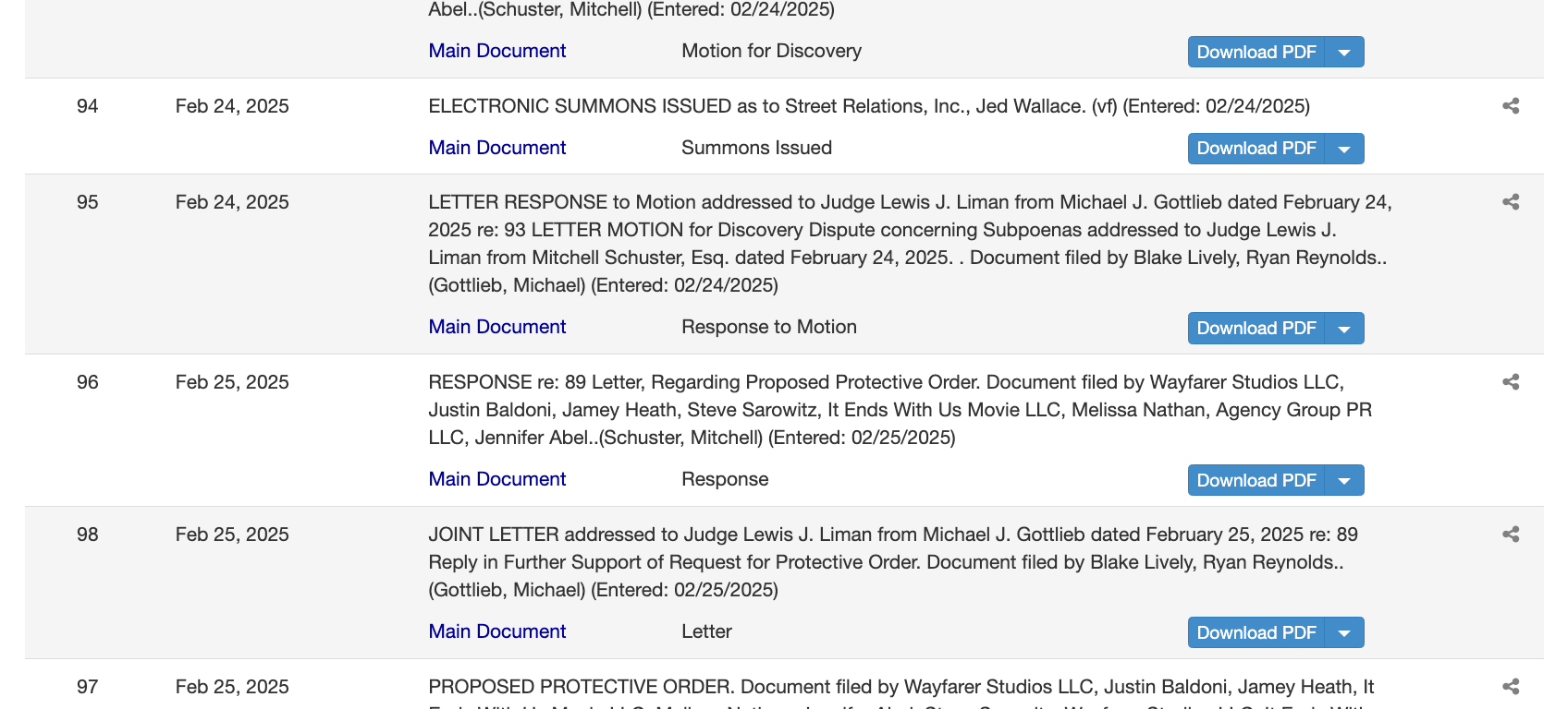 Lively’s counsel (Document 95) defended the subpoenas as standard discovery practice, noting they’ve already narrowed the requests by removing location data and limiting timeframes.