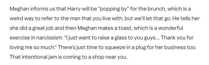 True to form, Meghan slips in plugs for her business ventures throughout the series. Her homemade jam, destined for retail shelves, becomes a recurring symbol of the show’s overarching message: the celebration of even the most trivial domestic pursuits. At one point during a toast at a family brunch—where Prince Harry makes a brief appearance—Meghan’s gratitude for being loved almost seems like an elaborate exercise in narcissism.