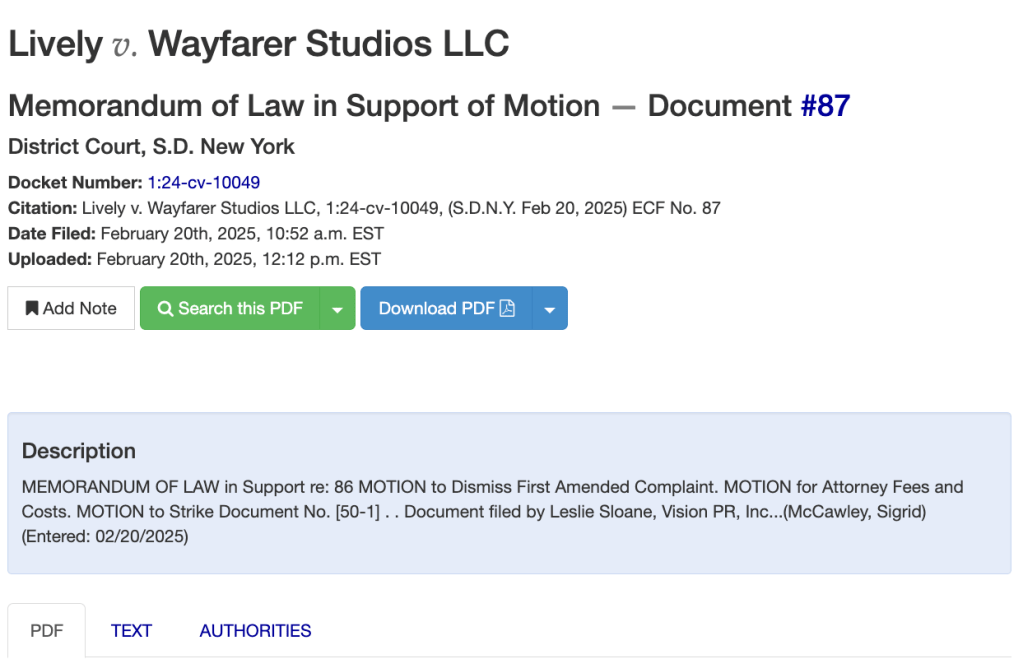 - Group Defamation Cases (Appalachian Enterprises) – Strengthen Sloane’s argument that Wayfarer’s vague allegations are not specific enough to survive dismissal.