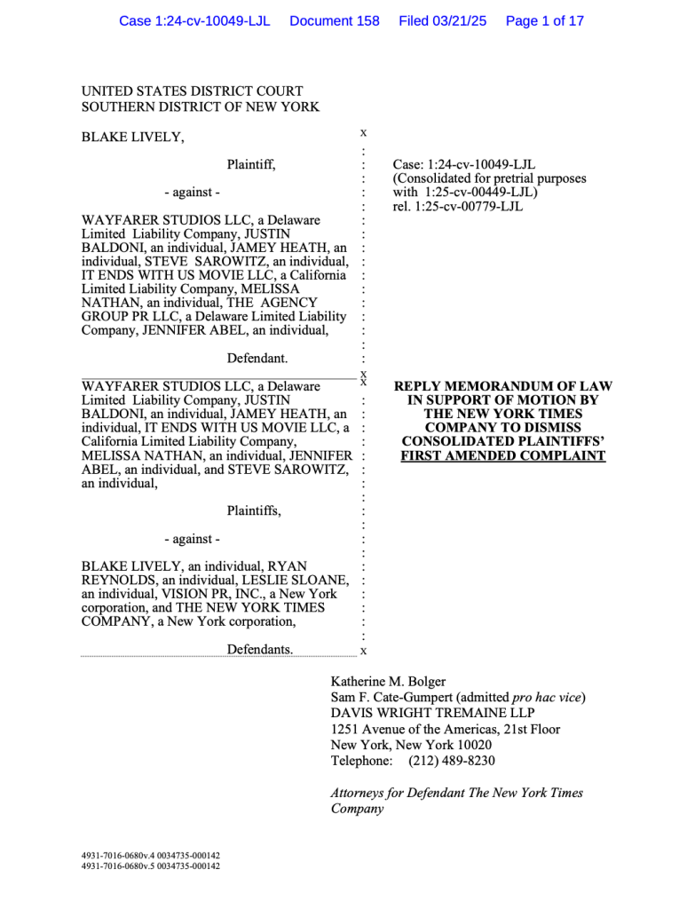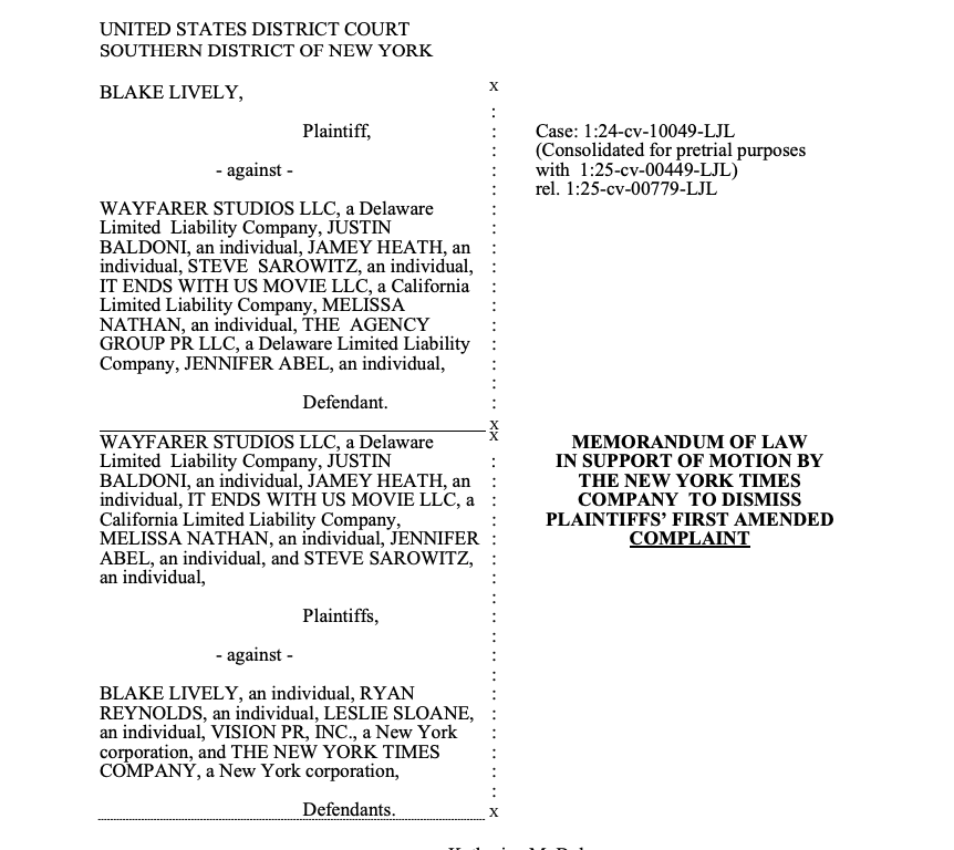 The documents shared are legal filings from a complex lawsuit involving Blake Lively, Justin Baldoni, Wayfarer Studios, The New York Times, and various other parties. This dispute stems from the production and promotion of the 2024 film “It Ends With Us.” WF etc filed a First Amended Complaint at Dkt. 50 noted below.