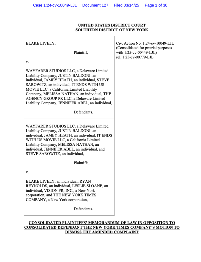 - Wayfarer Parties’ Memorandum opposing The New York Times’ motion to dismiss