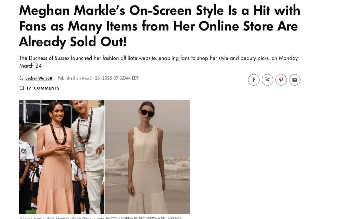 Lyndie Benson, founder and CEO of luxury clothing brand Bleusalt, told The Wall Street Journal that Meghan is in a “league of her own” when it comes to style influence. This assessment seems increasingly difficult to dispute as the sell-out pattern continues across price points from affordable to luxury.