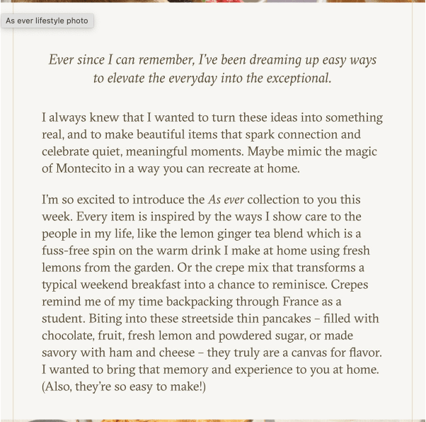 In her personal note, she reflects on the meaning behind the items: “Maybe mimic the magic of Montecito in a way you can recreate at home.” From the lemon ginger tea blend (inspired by the drink she makes at home with lemons from her garden) to the crepe mix (a tribute to her student days backpacking through France), everything in the As ever line comes with a story. But more importantly, each product is framed as a memory, a ritual, a quiet rebellion against the rush of daily life.