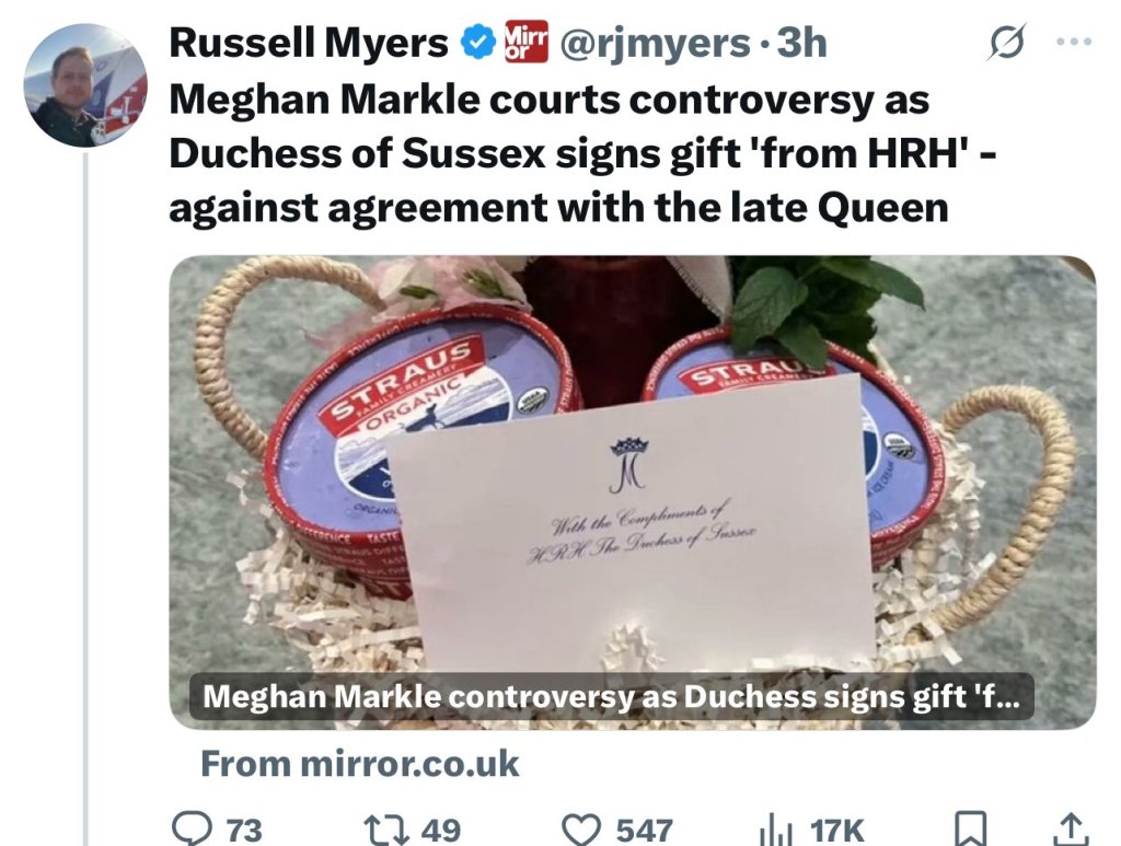 A photo showing a gift basket with a card reading “with the compliments of HRH The Duchess of Sussex” has sparked debate about royal title usage. Critics claim this violates Meghan and Prince Harry’s agreement not to use their HRH titles after stepping down as working royals in January 2020.