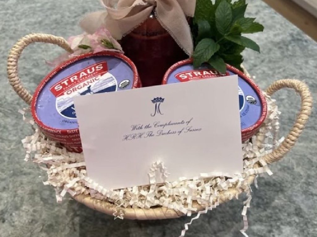 A photo showing a gift basket with a card reading “with the compliments of HRH The Duchess of Sussex” has sparked debate about royal title usage. Critics claim this violates Meghan and Prince Harry’s agreement not to use their HRH titles after stepping down as working royals in January 2020.